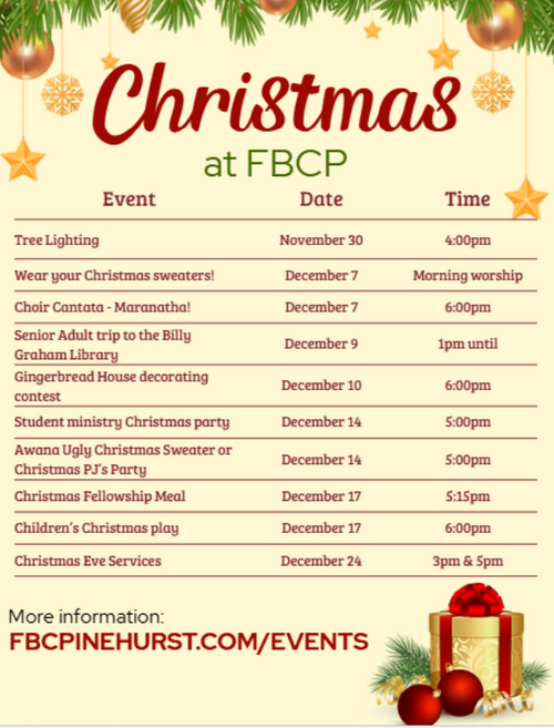 Sign up on the WMU board or online at fbcpinehurst.com. For more information, contact Ruth Todd, WMU Co-Director, at 910-315-1430.